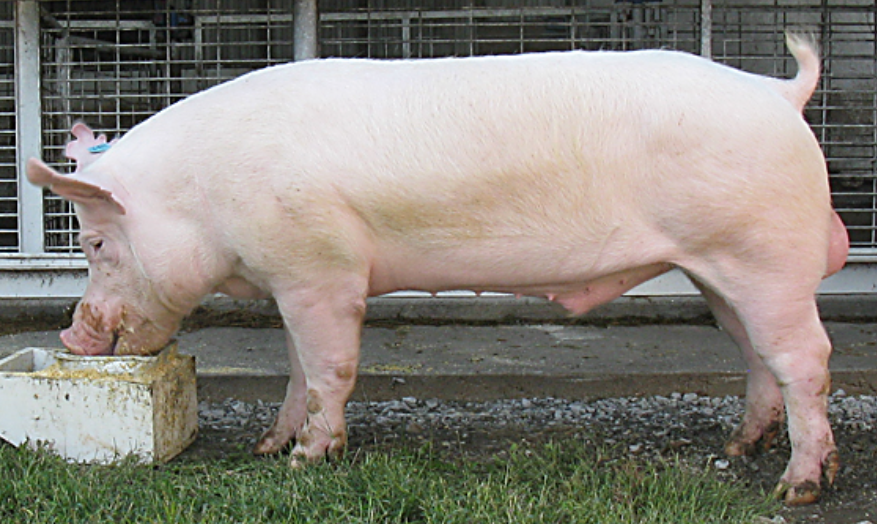 가장 보편적으로 볼 수 있는 살색에 돼지인 요크셔 종이다. 이 돼지의 가장큰 특징은 귀가 쫑긋 서있고 다리가 굵다는 것이다. 돼지에게 발은 아주 중요하다. 구제역도 발에 염증부터 시작하게 되므로 쉽게 기를 수 있고 그만큼 보편화 되어 있다고 볼 수 있다.
